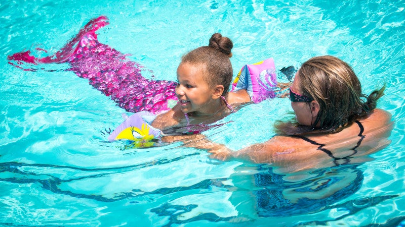 Includes: One hour private mermaid-swimming course in the pool, mermaid tail rental for guests, games.