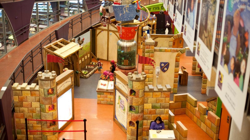 This beautiful library is worth going to just to see the building itself—it has floor to ceiling windows, an open stairway and a four story atrium. One of those floors is entirely devoted to kids. You’ll find area for reading, story times and a world map made entirely out of coins. The Early Learning Center for ages newborn to five offers the younger crowd a place to play and learn with exhibits and displays like steering wheels, fans, movable magnets and wooden pegs and portholes. There’s also a giant tee-pee for them to play in!