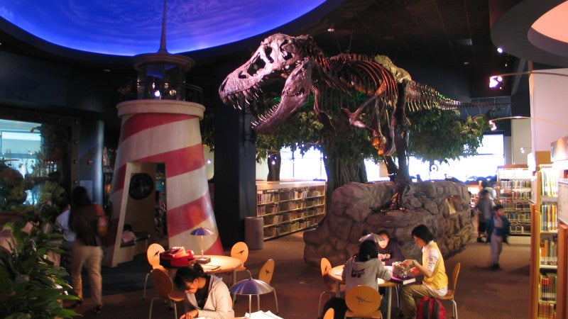 Step under the larger-than-life book stacks to enter a truly awesome kids’ section! Kids can curl up with a book in the lighthouse, participate in a read-aloud session and check out the saltwater aquarium and T. Rex fossil replica here. For serious adult bookworms, peak into the Old World Reading Room. It’s not suitable for kids but this room with rare first editions, a fire place, study space and chandeliers is worth looking into when you happen to be sans-kids.