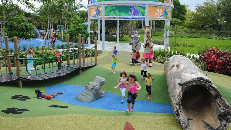 This combination wet and dry playground is built to let your kids run as wild as the animals at Zoo Miami. Jungle Journey has a jungle gym, wobbly bridge to cross, a life-size gorilla and hippo to escape, and a hollow log for climbing on and through. When they’re ready to cool off, they can head to Ocean Voyage to splash in 28 water features, including one of our favorite splash pad features in Miami—a whale tail waterfall.