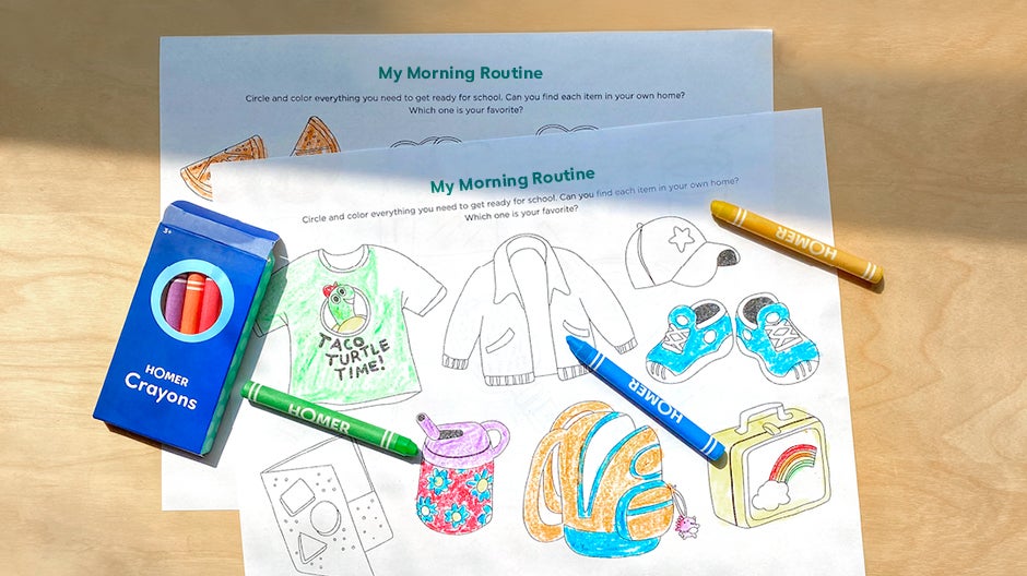 - Find all the items you use in the morning, and color them in with crayons or markers