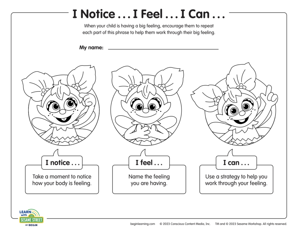 Want a simple way to help your child name their feelings? Try this free printable from Learn with Sesame Street. Kids can point to the face that matches how they feel.