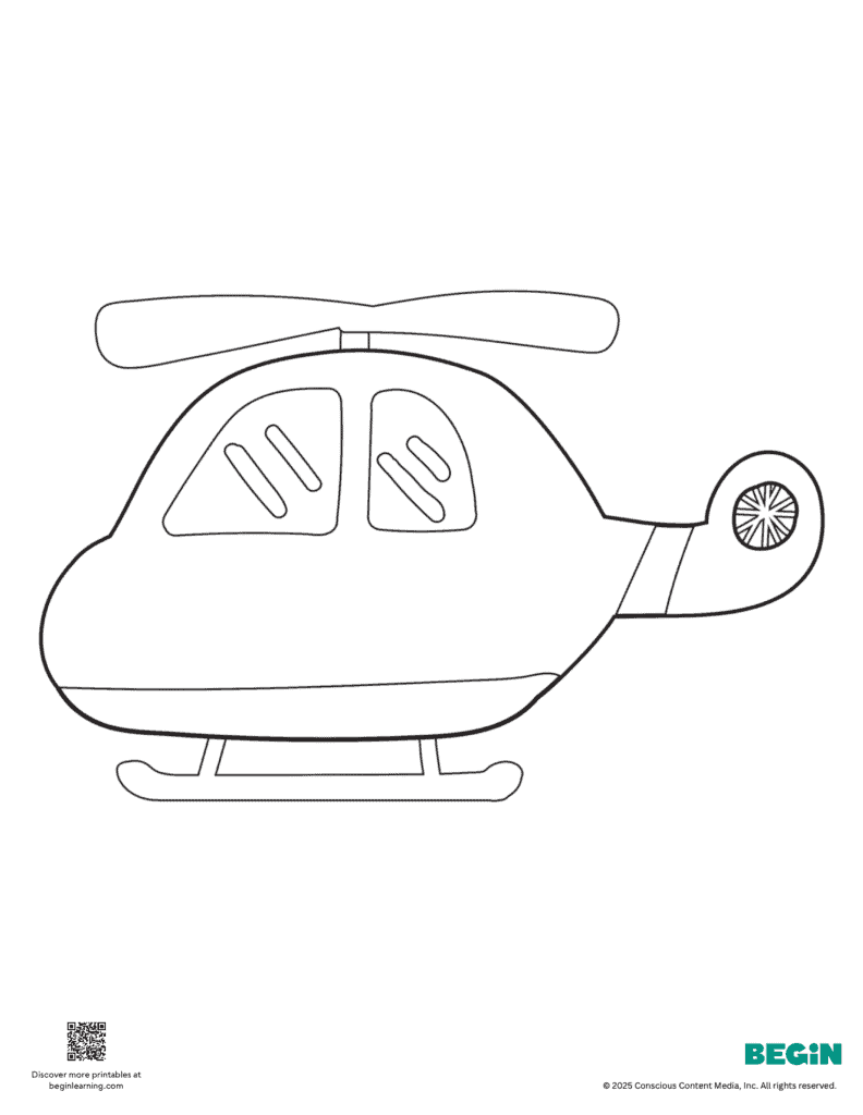 Free printable helicopter coloring page for preschool and kindergarten kids. Bold outlines, simple design, ready to print and color.